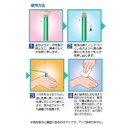 もぐさを紙筒に詰めたもので、モグサと皮膚との間に紙筒で空間を作って使用するお灸です。